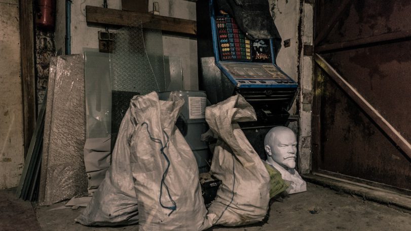 D’autres statues, il est vrai, ont trouvé leur place dans des musées d’art. D’autres encore traînent, abandonnées, au milieu d’objets hétéroclites ou de gravats. L’une demeure debout, mais solitaire dans une Maison de la Culture saccagée. Un artiste en a placé une série dans sa propriété, où les enfants peuvent les peinturlurer. Ailleurs, on peut voir une étrange statue transformée en cosaque, devenu un symbole de la liberté de l’Ukraine. Enfin certaines d’entre elles ont été vendues au prix du métal… La reproduction de cartes postales de l’ère soviétique nous permet de voir nombre de ces statues alors en pleine gloire, debout et in situ. Relevons le fait que les photographies de Niels Ackermann feront l’objet d’une exposition aux Rencontres d’Arles en juillet 2017.